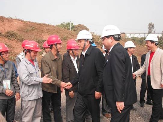 當(dāng)天,楊道喜副主席來到玉鐵5標(biāo)K56+365.291沙田互通建設(shè)現(xiàn)場(chǎng),當(dāng)看到著裝整齊、精神抖擻的廣西路橋員工隊(duì)伍,感受到大干旱季、沖刺收尾階段的熱烈氣氛時(shí),楊副主席上前與項(xiàng)目員工一一握手并親切問候到:“廣西路橋的員工,你們辛苦了”。他鼓勵(lì)廣西路橋建設(shè)者要做好廣西交通基礎(chǔ)設(shè)施建設(shè)的排頭兵,在確保質(zhì)量、安全的前提下,克難攻堅(jiān),全力推進(jìn)工程建設(shè)進(jìn)度,堅(jiān)持年底完成全線主體工程的目標(biāo)不動(dòng)搖,為玉鐵高速公路的建設(shè)做出積極貢獻(xiàn),為推動(dòng)廣西經(jīng)濟(jì)社會(huì)又好又快發(fā)展做出新的更大貢獻(xiàn)。