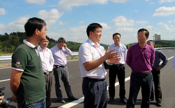 圖1:自治區(qū)交通運(yùn)輸廳廳長潘?。ㄗ蠖┱J(rèn)真聽取項目相關(guān)負(fù)責(zé)人介紹項目建設(shè)情況,集團(tuán)公司董事長朱堅和(右三)陪同檢查。